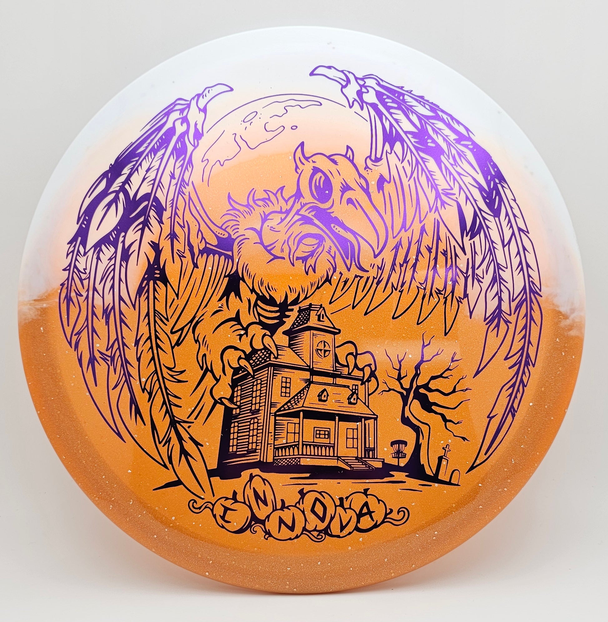 This Roc3 features "Duo", Innova's newest molding process. Every disc is a unique blend of white Star and orange Metalflake materials forming one hauntingly beautiful disc. Then, you add the scary-oversized XXL Halloween Roc stamp and now you have a treat for collectors and players.